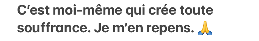 01/1Frédérique .Ce matin, les premières prosternations de l’année. Je fais le vœu de les faire chaque matin tous les jours de cette année 🙏 Ma phrase de pratique fait remonter à quel point je suis à l’origine de toutes mes souffrances. Je fais le voeu de me repentir chaque jour de ce qui génère en moi la souffrance qui rejaillit ensuite sur le monde. Puissé-je déraciner une à une chaque racine de mes afflictions. 🙏 Puissé-je chercher bonheur et liberté à l’intérieur de mon esprit, réaliser que tout est vide, et trouver la paix, pour mon bien et celui d’autrui. 🙏 Puisse le monde se mettre à rechercher le vrai bonheur en cultivant la sagesse 🙏🌟