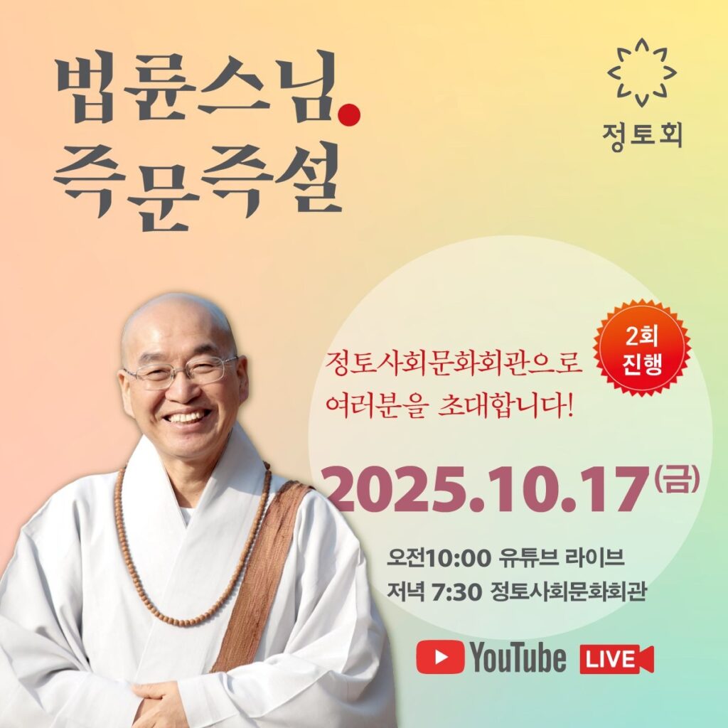 🟡법륜스님과🟢함께하는🟣행복한대화❤️ ✨일주일 행복루틴 금요일엔 즉문즉설!즉문즉설은🎙생방송으로~무엇이든 물어보세요~살다 보면 마주하는 크고 작은 문제들! 🙃법륜스님과의 행복한 대화를 통해 삶의 지혜를 배우는 시간입니다.소중한❤️사람과 함께해요😊~이번주는 오전에 온라인, 저녁에 오프라인으로 두 번✌🏻진행됩니다.☺️✨(오프라인 즉문즉설은 유튜브 생방송으로 동시진행 됩니다.)⭐️10월17일 금요일 생방송⏰오전 10:00 (한국시간) 온라인https://youtube.com/live/W44numTbJSU?feature=share▶️생방송 줌 참여https://zoom.us/j/99028906809오전 즉문즉설 중 실시간 소통을 원하신다면 ⬆️Zoom으로 참여해주세요. 방송 중 직접 질문하실 수 있습니다! ⏰저녁 7:30 (한국시간) 오프라인 서울 서초동 정토사회문화회관https://youtube.com/live/ysDx_9QO3qY?feature=share