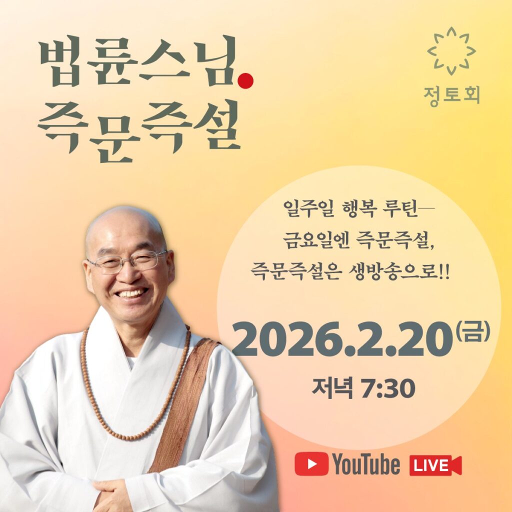 🟡법륜스님과🟢함께하는🟣행복한대화❤️ ✨일주일 행복루틴 금요일엔 즉문즉설!즉문즉설은🎙생방송으로~무엇이든 물어보세요~살다 보면 마주하는 크고 작은 문제들! 🙃법륜스님과의 행복한 대화를 통해 삶의 지혜를 배우는 시간입니다.소중한❤️사람과 함께해요😊~⭐️2월20일 금요일 생방송https://youtube.com/live/xjBZCTqgYVg?feature=share⏰저녁 7:30 (한국시간) 온라인https://zoom.us/j/99028906809실시간 소통을 원하신다면 ⬆️Zoom으로 참여해주세요. 방송 중 직접 질문하실 수 있습니다!